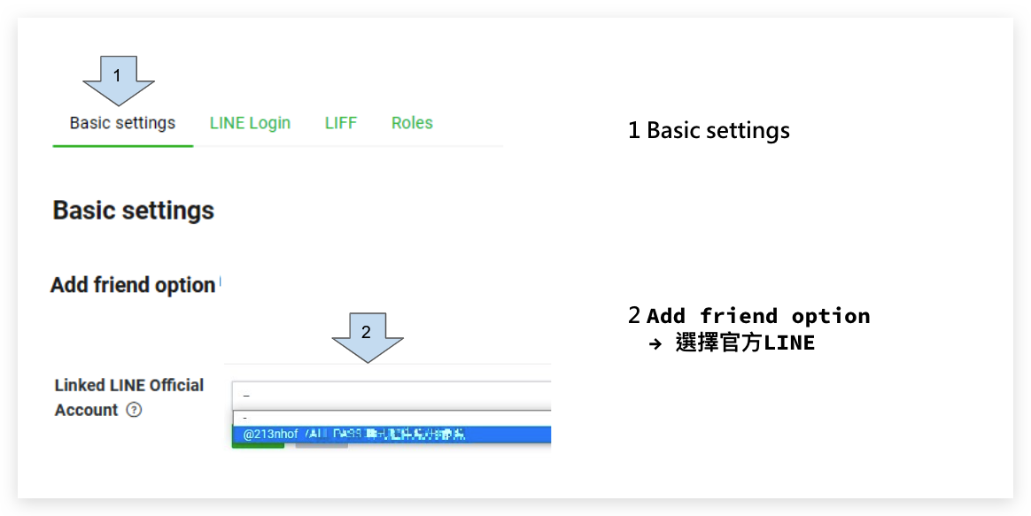STEP 4: 切換頁籤到「Basic settings」→ 下方選項「Linked LINE Official Account」→ 選擇官方LINE
