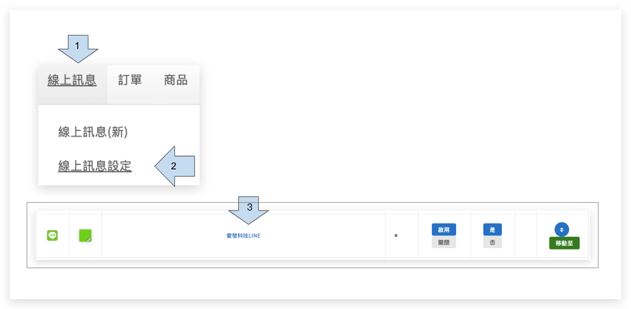 STEP 6-1: 系統 “線上訊息” → 點擊 “線上訊息設定“ → 點選“LINE帳號”