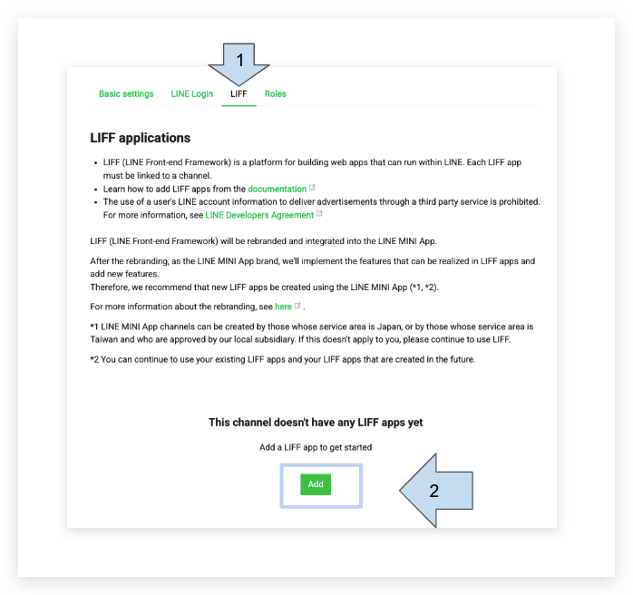 STEP 8: 回到 LINE Login 頁面 → 頁籤 ”LIFF ” → 點選”Add ”( 新增Add a LIFF app )