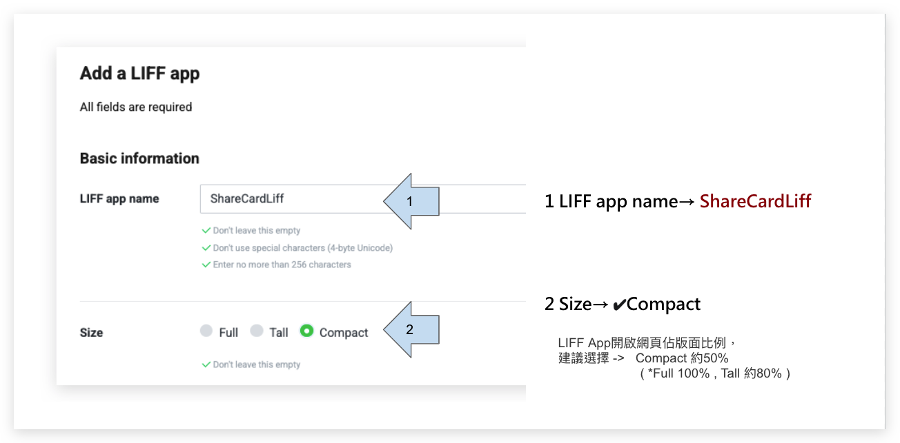 STEP 9 : 照圖片&項目,依序完成填寫 → 建立新的LIFF