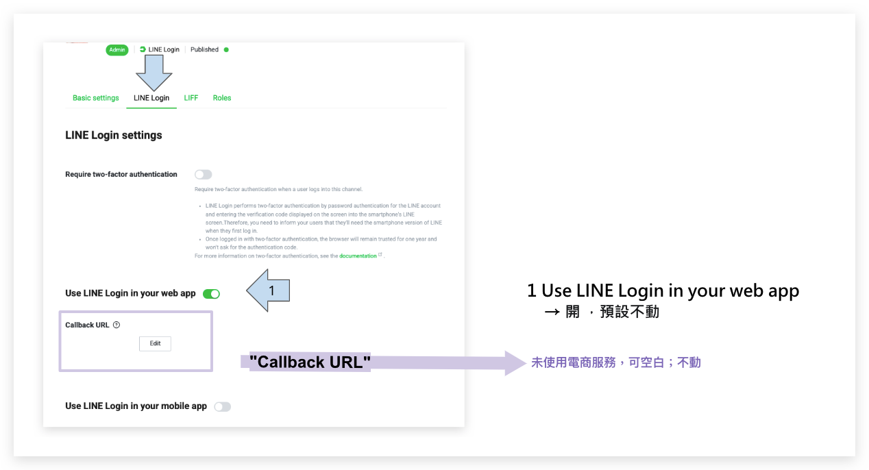 STEP 5: 切換頁籤到「LINE Login」→ 下方選項「Use LINE Login in your web app」→ 開