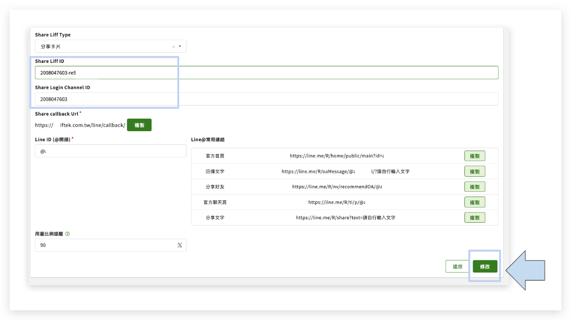 STEP 12: 點擊“修改” → 完成LINE分享卡片的LIFF串接設定