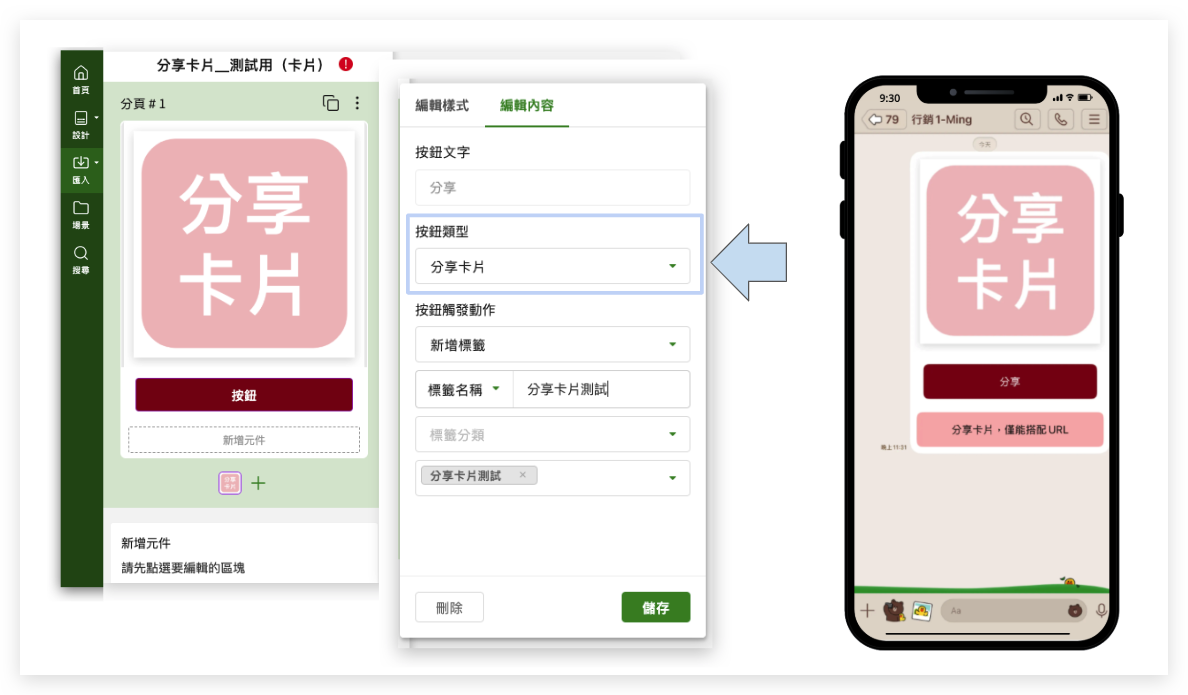 ★注意:設定卡片如使用「分享卡片按鈕」時,其他按鈕「只能使用網址連接」哦!